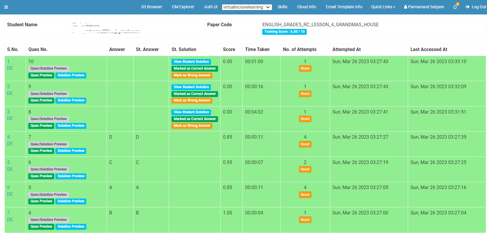 Preview submitted work, final outcomes, attempts, marks, time taken and more for comprehensive performance assessment.
